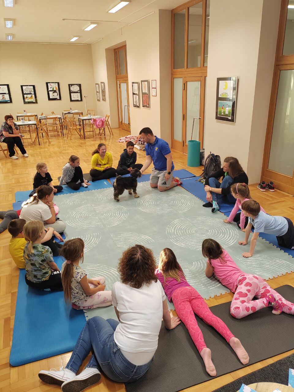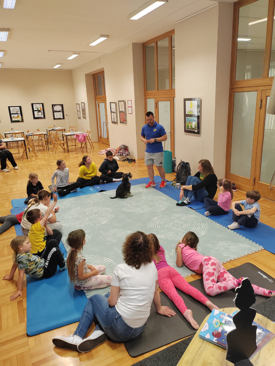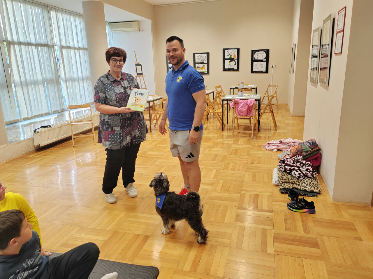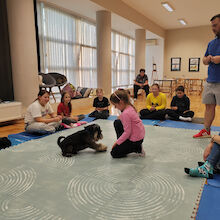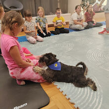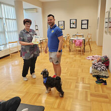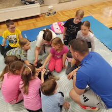 Sledilo je presenečenje večera. Obiskala sta nas Zoran Šutej in njegov kuža Lin iz društva Tačke pomagačke. Otroci so bili obiska izjemno veseli, še posebej, ko so Lina lahko pobožali in mu ponudili priboljšek. Zoran je predstavil delovanje društva, Lina in njuno poslanstvo, nato pa smo lahko opazovali, kaj vse kuža zna. Ob pesmi Kuža pazi nam je celo zaplesal.