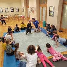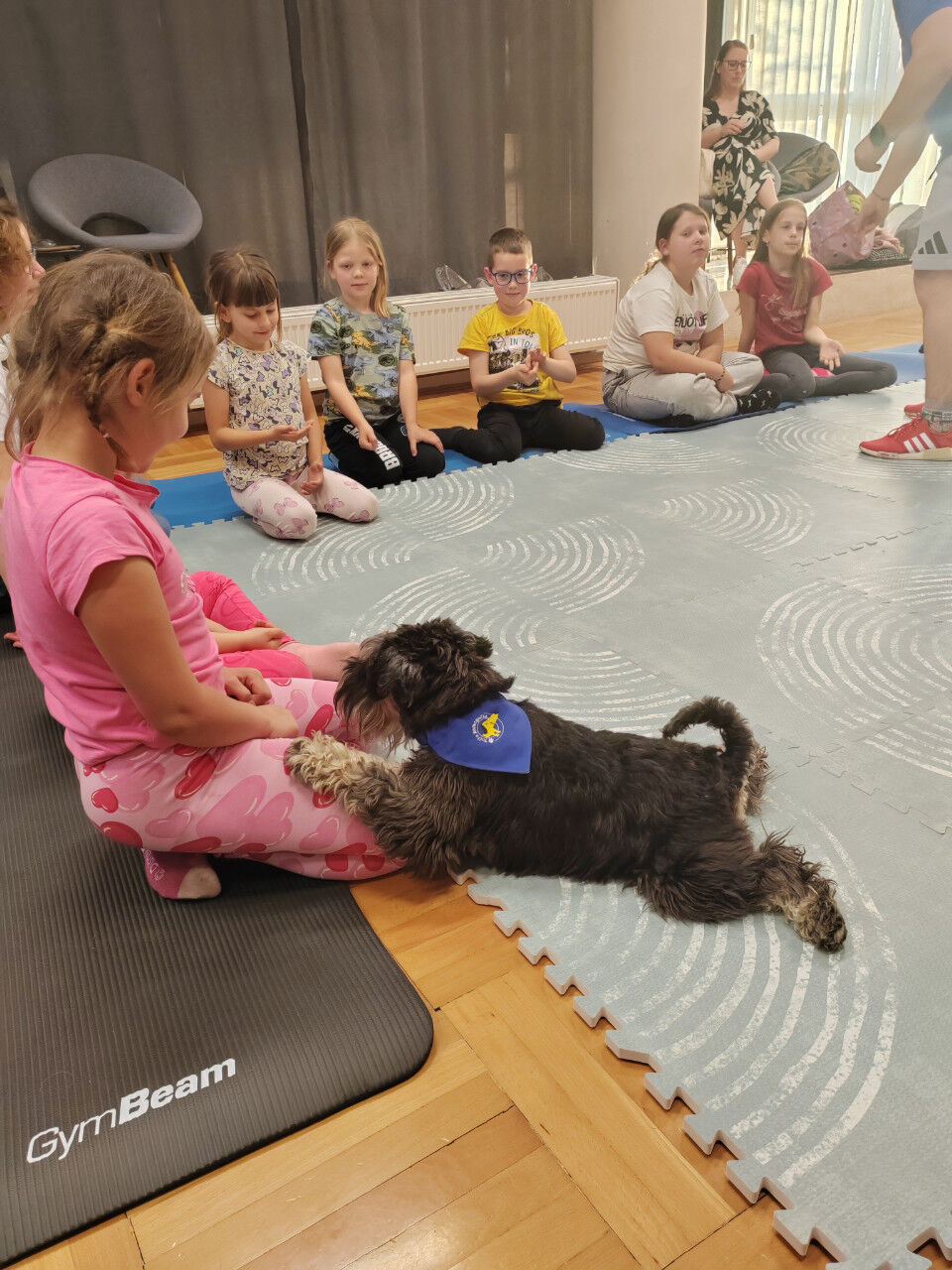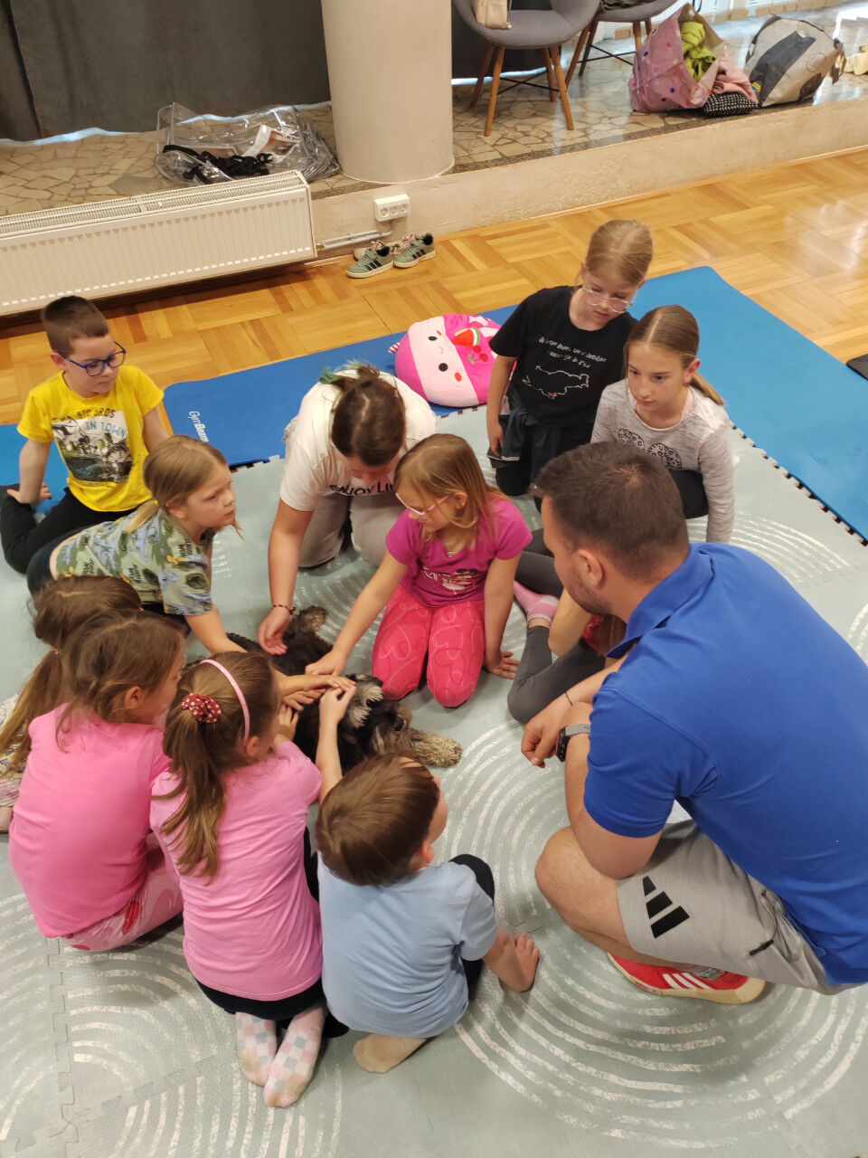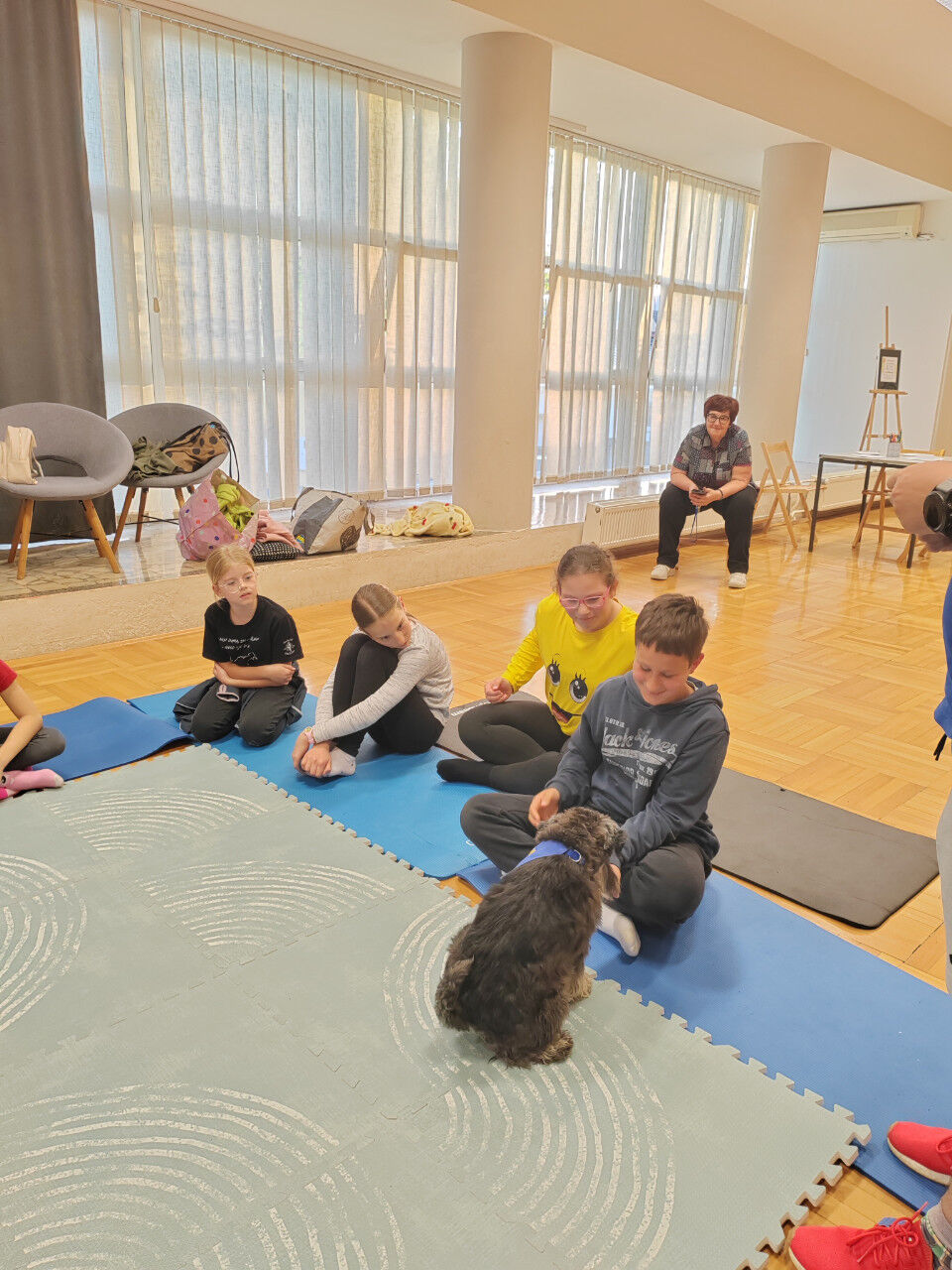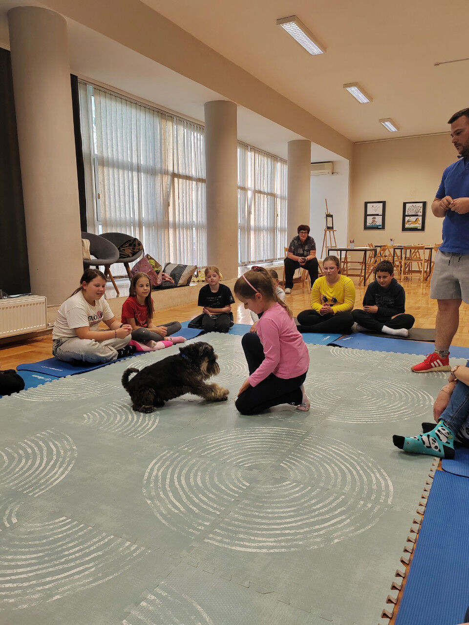 Sledilo je presenečenje večera. Obiskala sta nas Zoran Šutej in njegov kuža Lin iz društva Tačke pomagačke. Otroci so bili obiska izjemno veseli, še posebej, ko so Lina lahko pobožali in mu ponudili priboljšek. Zoran je predstavil delovanje društva, Lina in njuno poslanstvo, nato pa smo lahko opazovali, kaj vse kuža zna. Ob pesmi Kuža pazi nam je celo zaplesal.